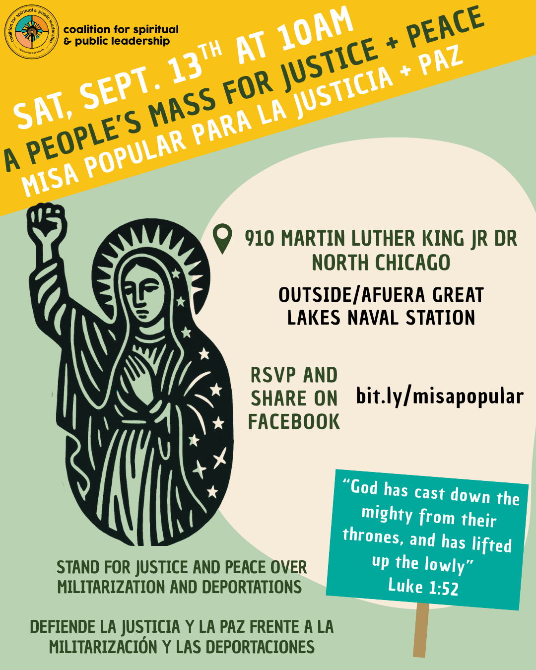 This is a moment for political holiness - the call to follow in the footsteps of the prophets, saints, and movement leaders who came before us, teaching us that nonviolent action can achieve a world more reflective of God’s love. Today, we take up that same call. On September 13th at 10AM outside of the Great Lake Naval Base, we invite you to gather with us for an outdoor People’s Mass in prayerful resistance, united in our commitment to justice, mercy, and liberation.