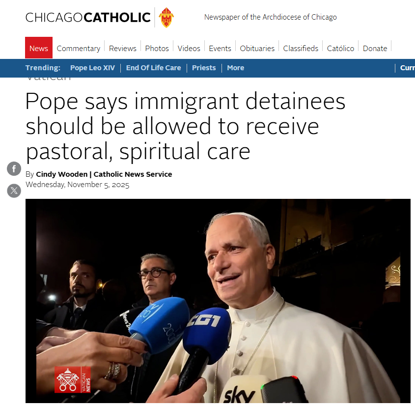 November 5, 2025 - Chicago Catholic: Pope says immigrant detainees should be allowed to receive pastoral, spiritual care